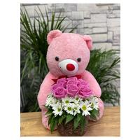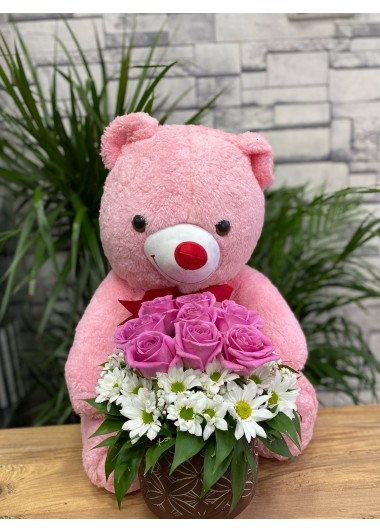 Saksıda Pembe Güllü & Pembe Büyük Ayıcıklı Çiçek