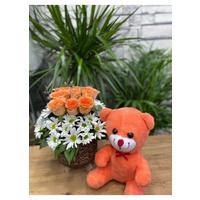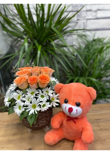 Saksıda Turuncu Güllü & Turuncu Ayıcıklı Çiçek